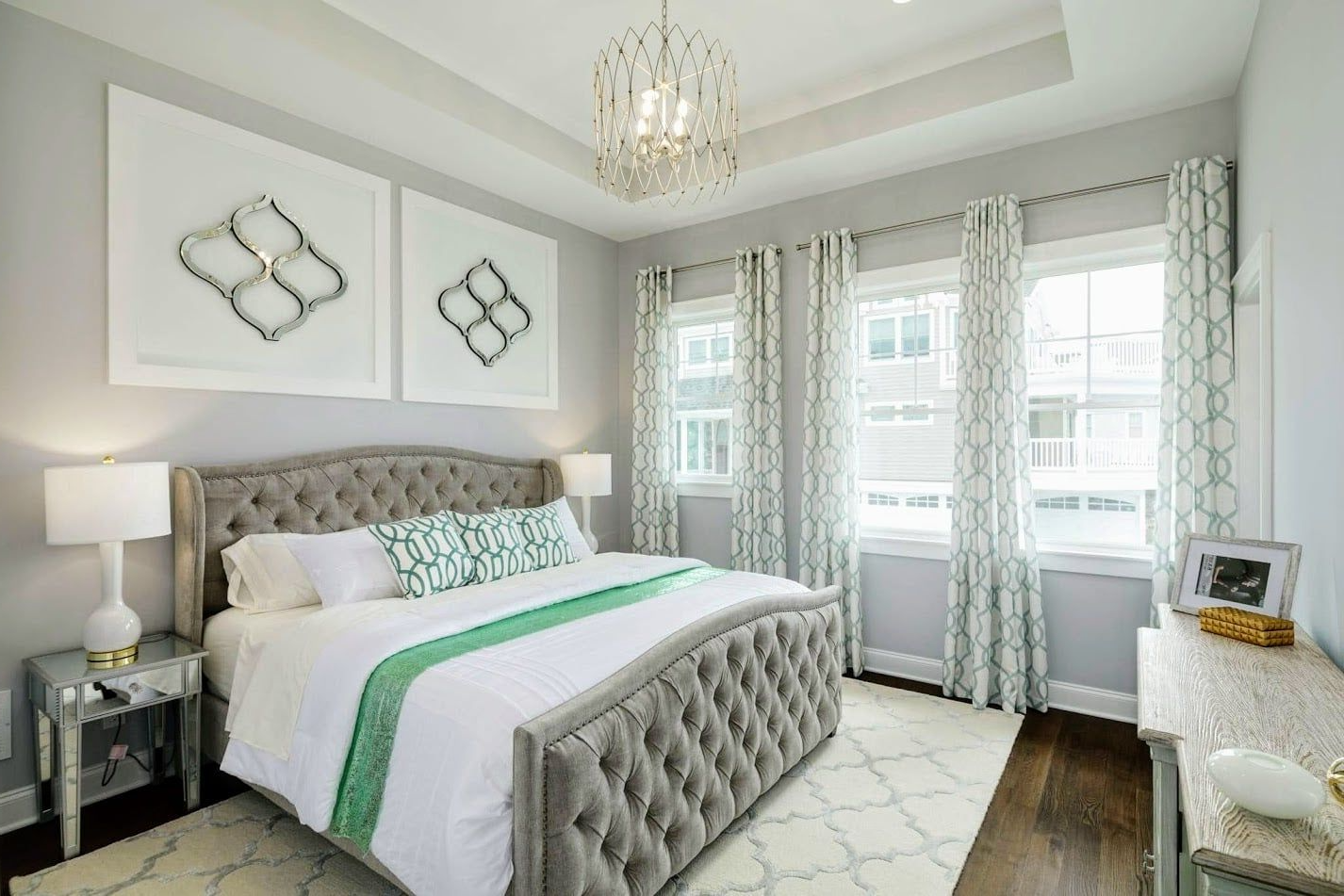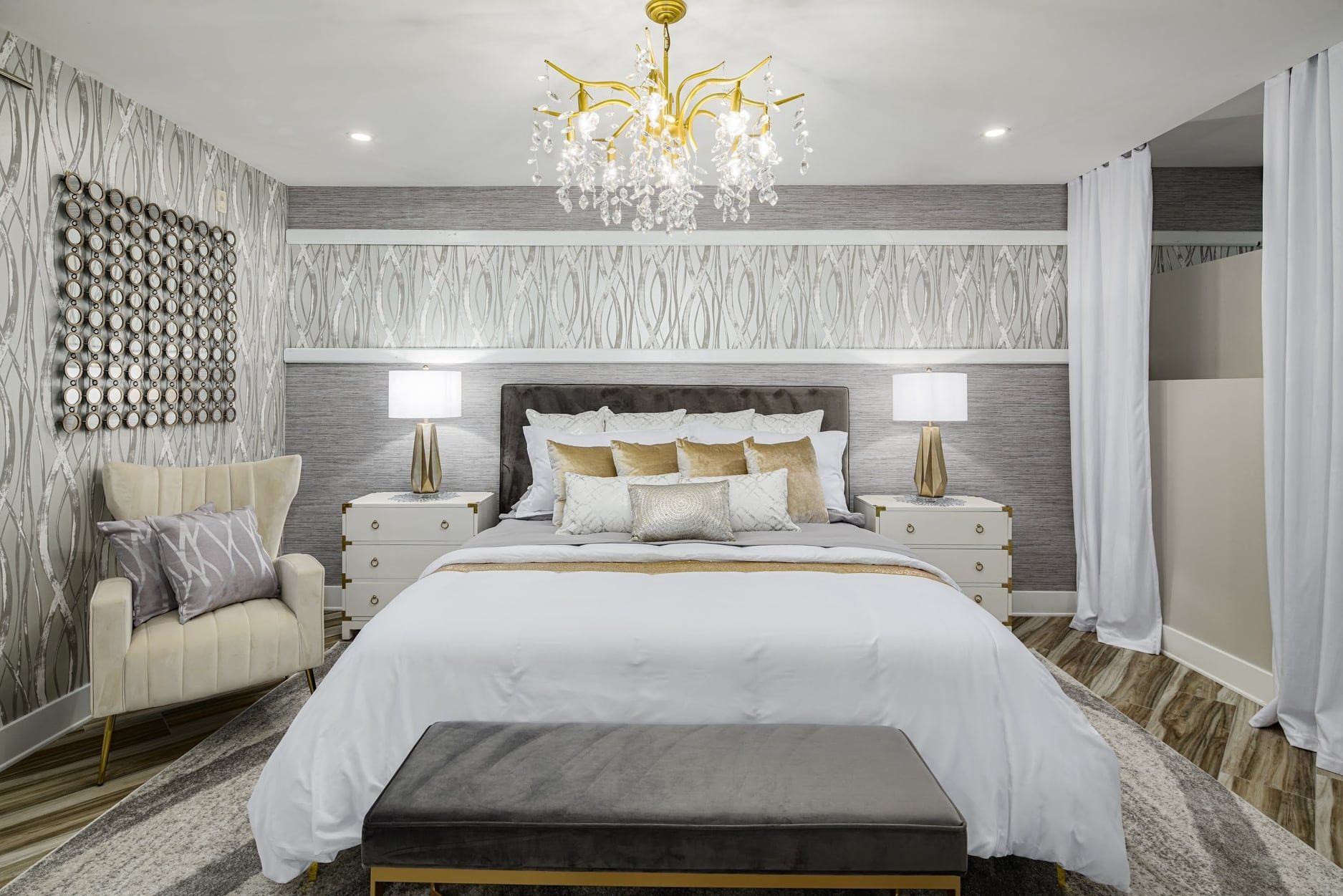 The wallpaper and chandelier were showstoppers in this master bedroom makeover. If you have windows at the top of your wall, then see how you can hang curtains from your ceiling, too!