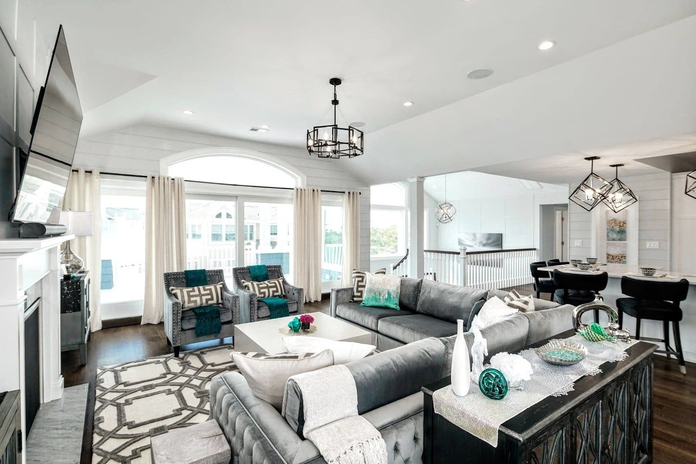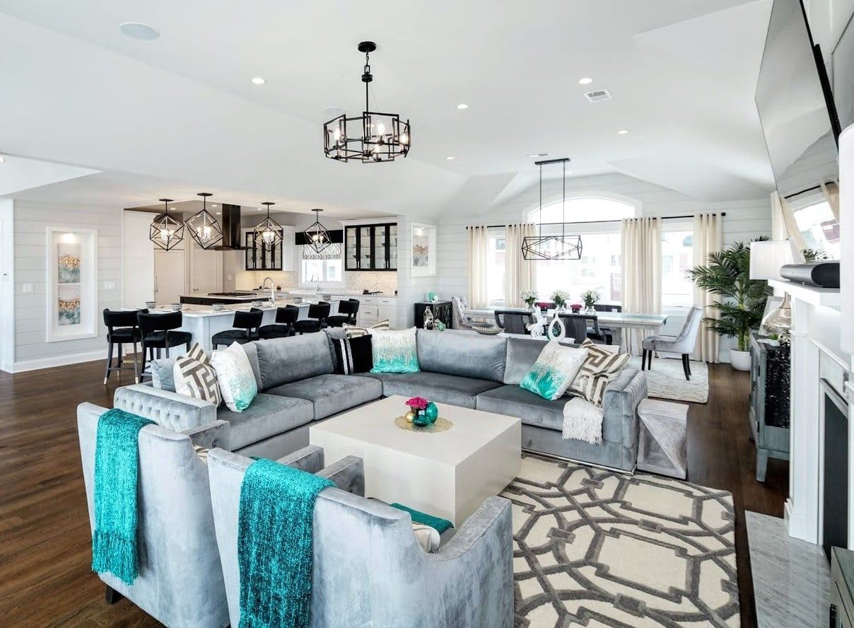 This product list only includes products in the living room portion of this great room. For products shown in the dining room and kitchen, please click below.